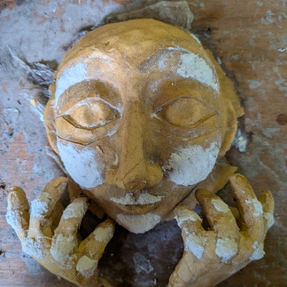 I made a very simple wire armature of the hands, and then I bulked up the shape of the hands just with some tape and paper, and a cotton pad to get a little bit of bulk. I covered that with masking tape to seal it up, and then did one layer of paper mache over that. Then, I bent the fingers into an interesting shape while everything was still wet. Back to the face, after three layers of papier mâché, I wanted to add a little more dimension, to help pick up highlights later for when I go to paint it. I used a little bit of paper clay to add a little bit of height to the roundness of the cheek and the brow bone, the tip of the nose, the tip of the chin, just to add a little bit of depth overall. Then I did the same thing to the hands. After I did two layers of paper mâché on the hands, I really wanted to age the hands a little bit. They were looking a little pudgy, and young, and so I added little crests to mark the knuckles on the fingers and the thumb and across the top of the back of the hand. Once that had set, I did more paper mâché on top. I ended up with 5 layers of brown paper, and then one very thin layer of tissue on top of it.